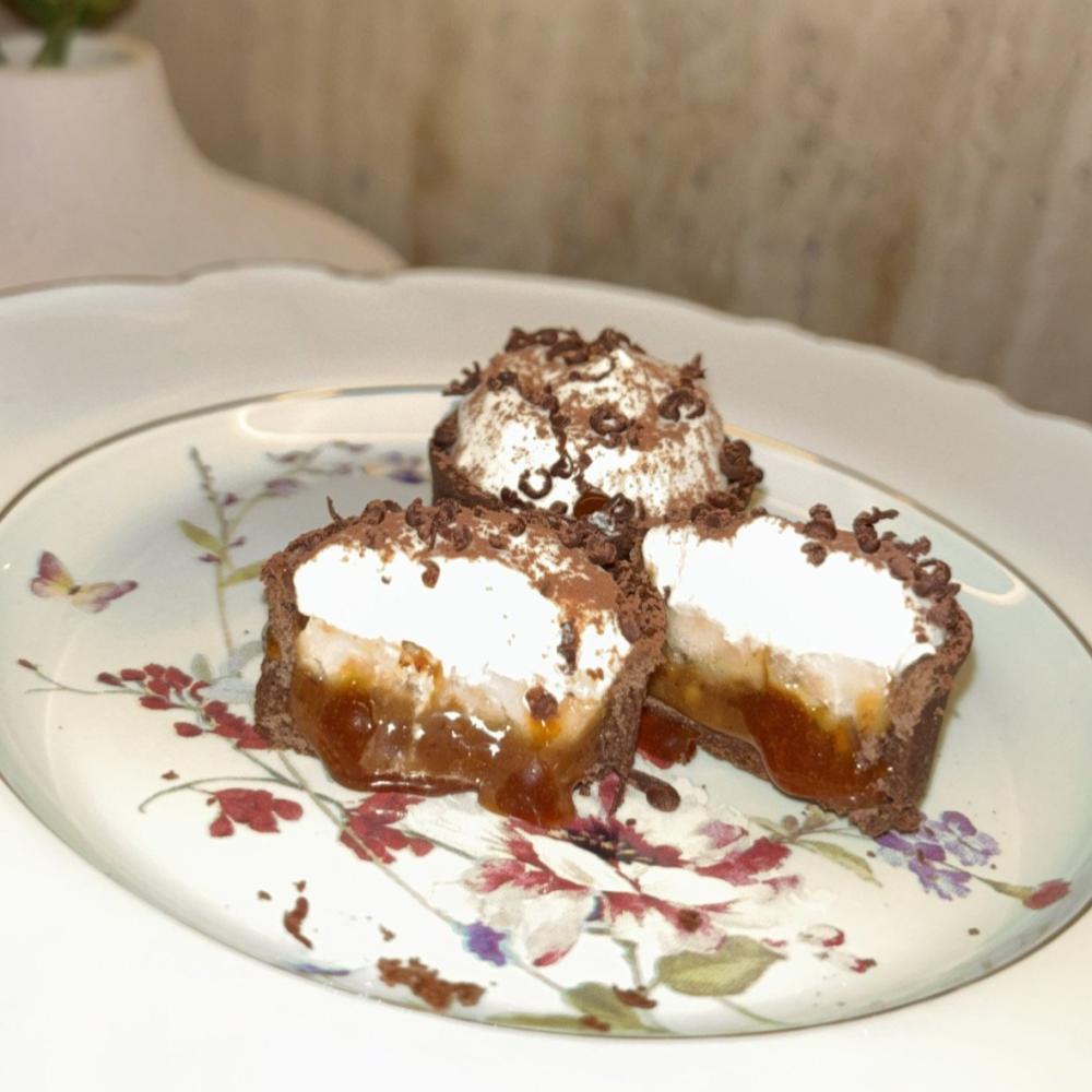 - المكونات الأساسية: تارت شوكولاتة، كراميل مملح، بيكان، موز، كريمة، رقائق شوكولاتة.