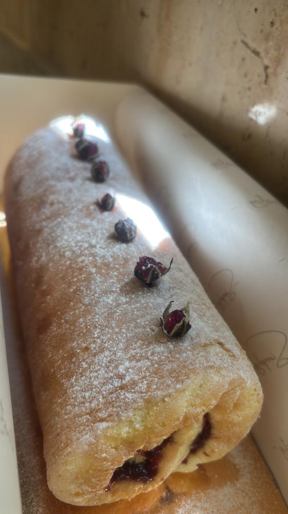لفة ناعمة من الكيك الإسفنجي الهش، تتخللها طبقة غنية من مربى التوتيات الطبيعية، بطعم متوازن بين الحلاوة والحموضة. تُزين برشة سكر بودرة لمسة أنيقة، وتُقدم كتحلية خفيفة تناسب كل المناسبات